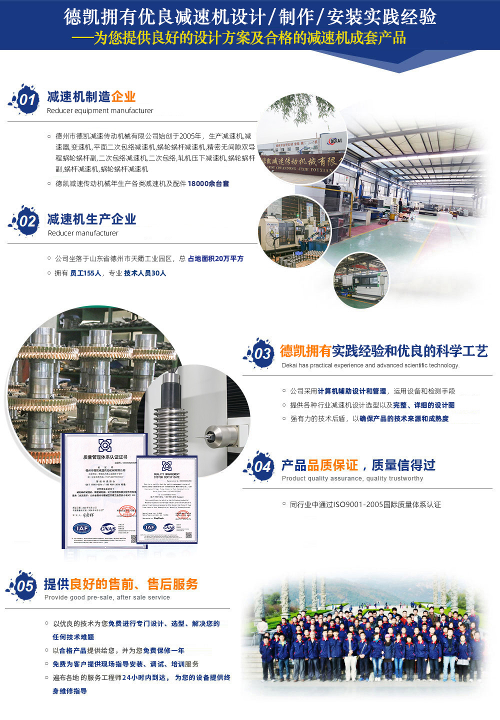 德州市德凱減速傳動機械有限公司,生產(chǎn)減速機,減速器,變速機,平面二次包絡(luò)減速機,蝸輪蝸桿減速機,精密無間隙雙導(dǎo)程蝸輪蝸桿副,二次包絡(luò)減速機,蝸輪蝸桿,軋機壓下減速機,蝸輪蝸桿副,蝸桿減速機,蝸輪蝸桿減速機,公司占地面積20萬平方,員工155人,技術(shù)人員30人,年生產(chǎn)各類減速機及配件18000余臺套。在同行業(yè)中通過了ISO9001質(zhì)量管理體系認證。公司設(shè)備齊全、技術(shù)力量強大、檢測手段完善,引進國外大型數(shù)控二次包絡(luò)機床GJK75加工數(shù)控4臺,可加工到800二次包絡(luò)蝸輪蝸桿。引進漢江S7732蝸桿磨床3臺,精度可達5級。公司擁有輝光離子氮化爐4臺,經(jīng)該設(shè)備氮化后可提高蝸桿表面硬度、耐磨性高、提高疲勞強度、變形量小、耐蝕性、...